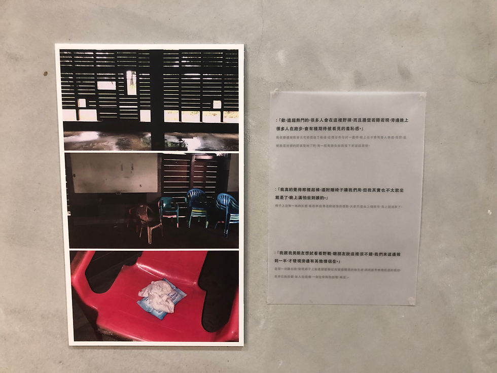 田野調查地點從與交友軟體使用者的對話中獲取,並實際走訪使用者所提供的約炮地點: 高雄市立總圖書館-同盟公園-三民公園-城中城大樓-鳳翔公園-衛武營都會公園。田調中發現疑似約炮者存在的痕跡。除了影像文件,第一手田調經驗與使用者提供的描述產生對話,邀請觀者一同想像。